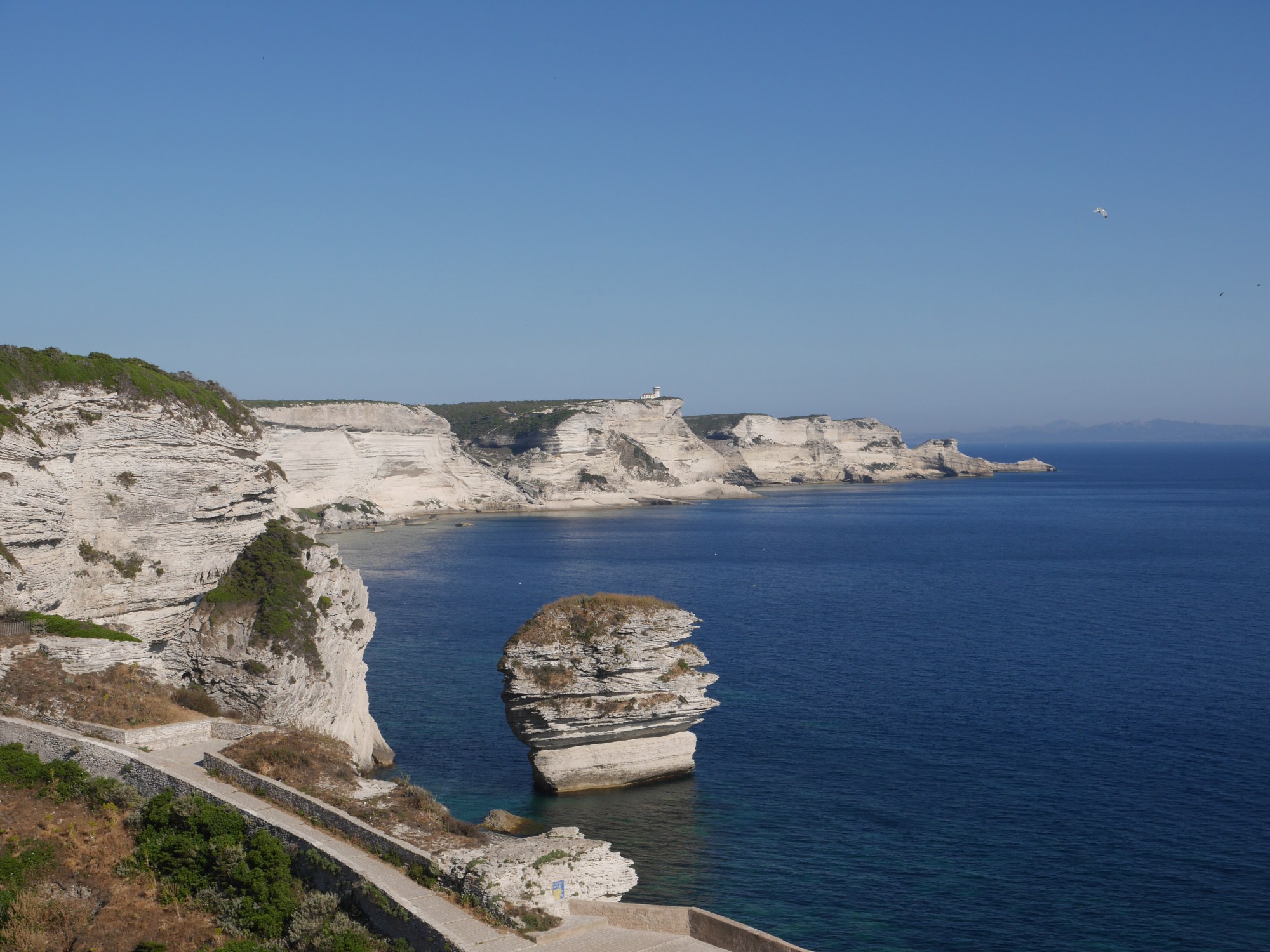 We decided to leave Italian waters for a couple of days and head across the Bonifacio Strait to the Corsican town of Bonifacio. We’re getting used to seeing castles and towns perched on cliffs and pondering the effort required by the original builders. We’ve seen it in Portugal in Sintra, in Spain in Guadalest and in Sardinia in Bosa, amongst many other places, but nothing quite prepared us for Bonifacio. A former Genoese town, like Castelsardo, Bonifacio’s haute ville appears to melt into or out of the layered white limestone cliffs. It is hard to see where cliff ends and buildings start, with many built precariously on the overhanging rock. The harbour entrance is spectacular with high cliffs on both sides and fjord like inlets. We were, however, slightly distracted from the view by the huge ferry, speeding tourist boats and erratic charterers in the narrow channel. Even the marinero was hurtling around, completely ignoring the 5 knot speed limit. Getting into our berth was very stressful, for Stefan particularly at the helm. Never a good introduction to a new place!
