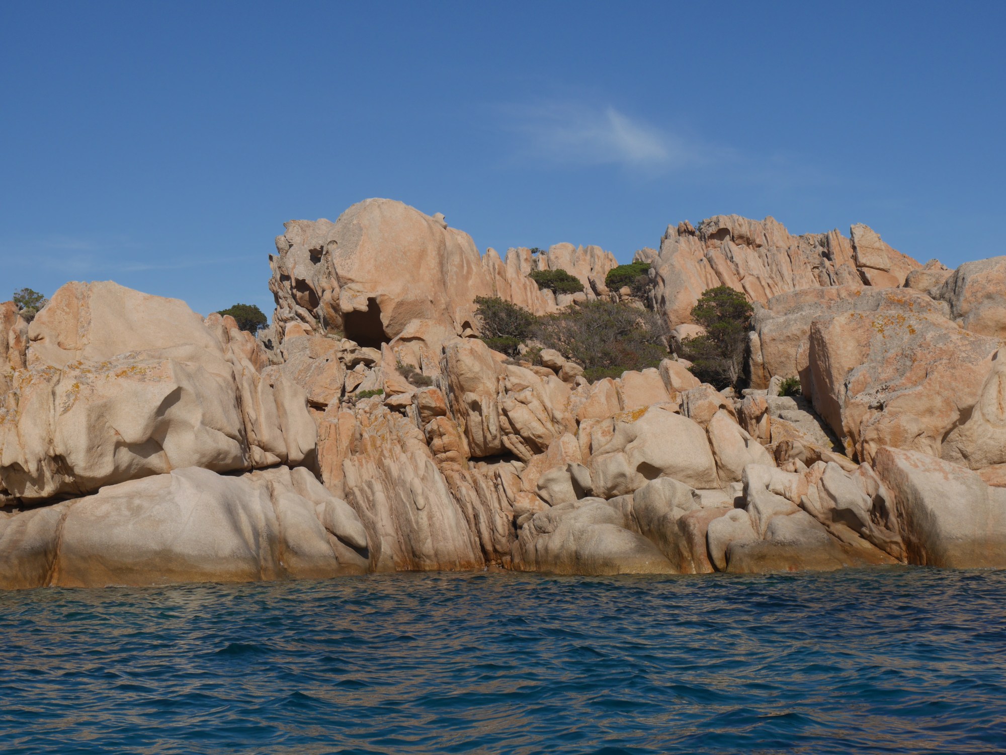 La Maddalena archipelago is a group of granite islands in the top north east corner of Sardinia. As somewhere to anchor for a week it came with lots of hazards to be navigated – lots of rocks above and below the water and lots of other boats, motor and sail, big and small, with varying degrees of knowledge of or adherence to the Collision Regulations! As hazardous as the rocks might be, their shapes were spectacular. Hewn by the wind, we could see granite rabbits, horses and hippos.