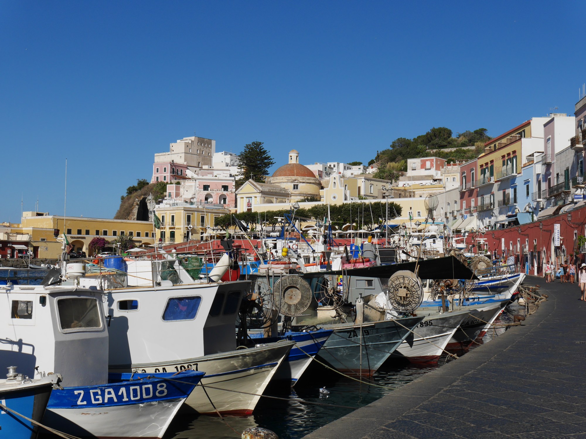 The tender ride into town was a chaotic dodge of small speedboats and playing chicken with the incoming ferry. Like Bosa and Castelsardo, Ponza’s town was a pretty, pastel patchwork of houses. Even the t-shirt seller and the café chairs had got the memo about everything being multi-coloured.
