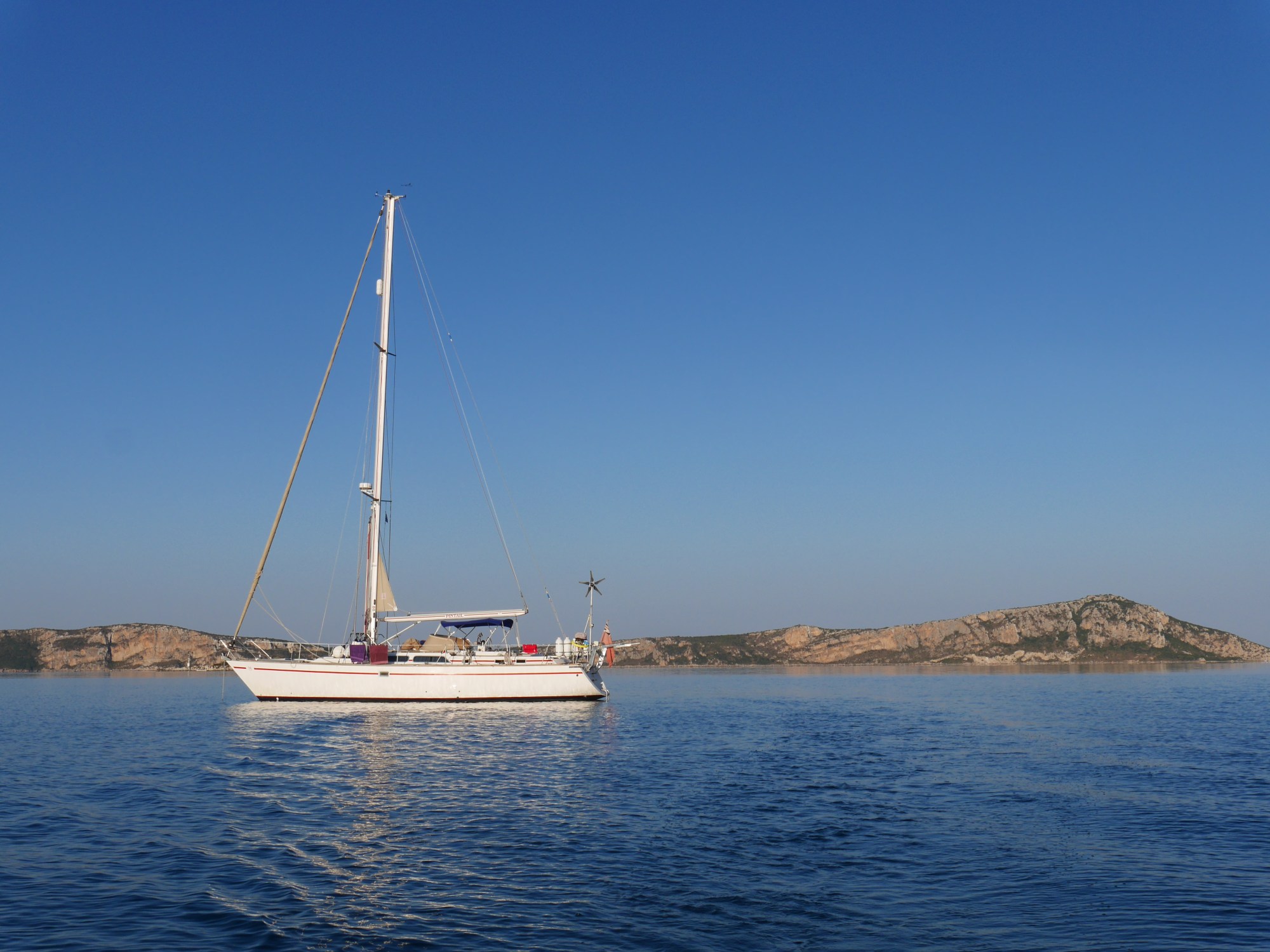 After Methoni we had intended to go to Finakounda only another hour away but poking Pintail’s nose towards the recommended anchorage we didn’t fancy the rocks on the seabed and as we had some lovely wind for sailing decided to continue round to Koroni. We successfully executed a perfect gybe (1) to get us through the small gap between the mainland and Nisos Venetiko.