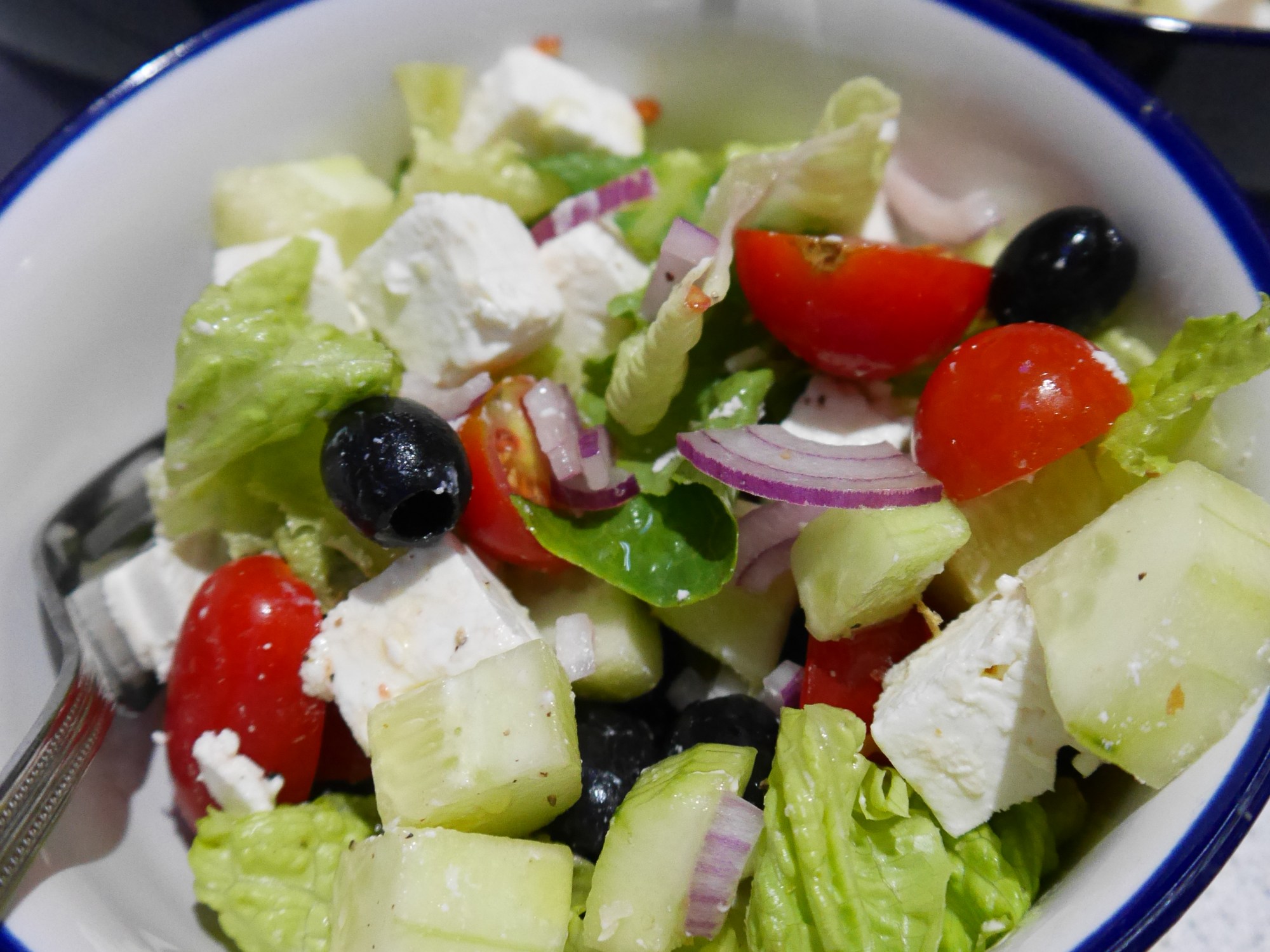 But none has had such a regular spot on our lunch menu than the humble Greek salad. Even outside Greece it is almost impossible not to find its core ingredients – lettuce, cucumber, red onion, pepper, tomato, olives, olive oil, lemon juice and feta cheese. The latter has the added bonus of a long shelf life so is perfect for stocking up and keeping on board. In Greece we picked up the dried oregano that, with a generous pinch, gives it that more authentic flavour but it is far from essential. We eat Greek salad so often, sat at anchor, alongside a harbour wall or underway, that it takes a pretty special event to make it a memorable one but if there is one we will always remember it is the one we made with Ella, at anchor off Cefalonia when she came to visit with her mum and Lee. It must have been her expert chopping – it was delicious!