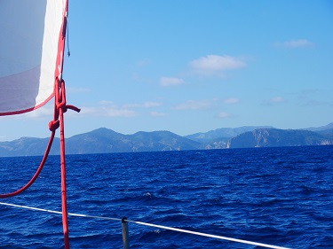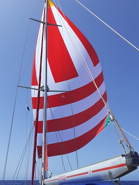 Soon, with perfect conditions, we put up the cruising chute and sailed on it the rest of the way – a perfect day at sea. We’re getting much braver at using it and in less of a tangle setting it up!