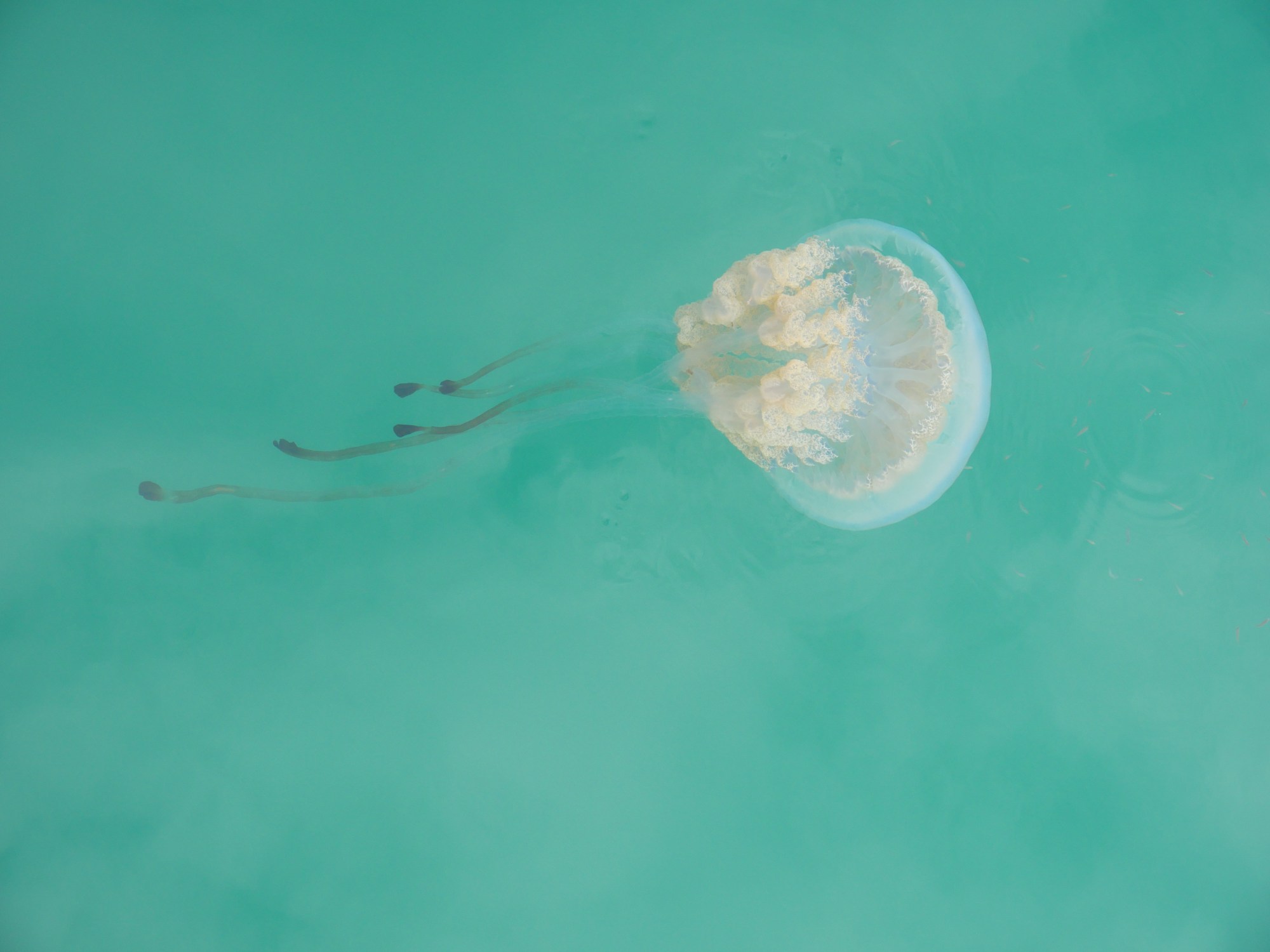 Alerted by a shout from Bear everyone around gathered to see a huge, white and frilly jellyfish swimming around the boat. And it really was enormous – probably 3 metres long from the tip of its white squishy head to the end of its brown tentacles. We watched it for a while as it swam under the boat and out the other side but couldn’t identify what type of jellyfish it was or whether those tentacles would sting. Whatever it was, none of us fancied swimming with it!