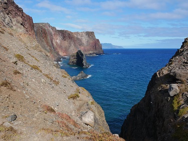The jagged peaks of Madeira emerged from a layer of cloud as we approached and are in sharp contrast to the more rounded peaks of Porto Santo. We were heading to an isolated anchorage tucked behind Ponta de São Lourenço, a spiny peninsula of bare rock that sticks out like a tail at the south east end of the island. So spiny, long and thin that it is known as the Dragon’s Tail.