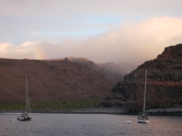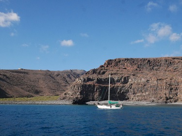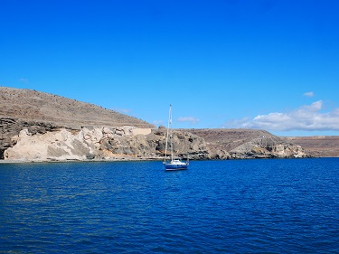 Logic told us that the anchorage at Playa de Chinguarime would be protected from both wind and swell and when we arrived it certainly seemed like a good choice. Strong wind whistled off the cliffs keeping us steady but when the wind dropped an inexplicable swell in the opposite direction to the wind worked its way towards us and we were rolling from side to side. There was nowhere safe to access land so we stayed on board. Still, the view was pretty amazing and with a pair of binoculars we could even watch the crazy, naked hippies who lived in tiny caves in the cliffs!