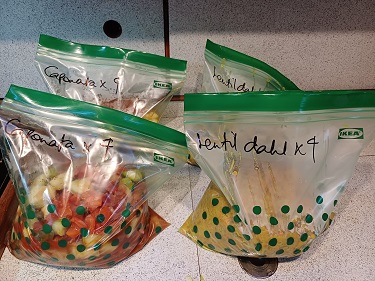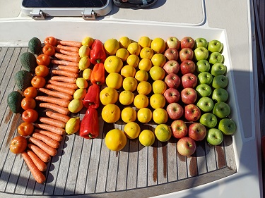 In the week before we left it was time to start preparing a load of meals for the freezer. We wanted to make sure we had things that would be easy to prepare if the conditions made life below difficult. In the end the freezer was packed full of curries, chillies, stews, tagines, pasta sauces – enough for 18 evening meals – ready to defrost and reheat along side rice, pasta or couscous. A couple of days before we left, Will and I headed to the market to get all our fresh fruit and vegetables. We needed to choose the vegetables carefully for their longevity so we stocked up on a lot of onions, carrots, cabbage, sweet potato, squash, tomatoes, peppers, cucumber and avocado. We also got enough apples, oranges and bananas for one piece of fruit per person per day as well as some lemons. All the vegetables were carefully washed and dried to help them last longer and we put up new nets under the solar arch to store all the oranges. There was barely a single space left on the boat that wasn’t filled with food or drink!