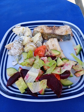 During this watch, lunch might involve us sitting together in the cockpit eating a bowl of salad (until our fresh supplies ran out) or some bread, crackers or wraps with cheese (or pate or cold meat for Ben to ensure he got his meat quote on this almost vegetarian ship!). But we often sorted out lunch for ourselves as those on late night watches had eaten breakfast late and we were all hungry at different times.