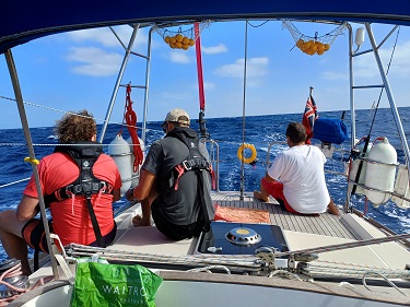 Early in the passage Stefan had got us to all draw straws for who would trigger the emergency drill to replicate as best we could some unexpected situation which required everyone to leap into action. Will kindly chose this watch to call our ‘all hands on deck’ drill so no one’s night was disturbed. Even so, the three of us not on watch managed to all be busy with something when the call came and we had to scramble into our life jackets to throw the liferaft, grab bags and ourselves into the cockpit in readiness for the emergency that wasn’t!
