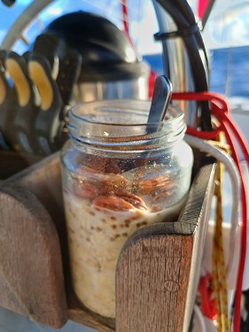 Whoever was on this watch was also the nominated Domestic for the day and was responsible for getting the boat ready for the day. With the daylight, our navigation lights and radar were turned off and our cockpit lamps were put on to charge. The cockpit was cleaned and tidied. Everyone was very respectful of our shared spaces during the passage but cleaning the cockpit became somewhat competitive! However, Ben set a very high bar early on in the passage and no-one else really ever got near the standard he set!