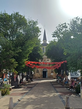 With half an hour to kill before our next bus, we ignored our taxi driver’s warning that tou e ferme le dimanche, and asked to be dropped in the centre of town. We wandered through the very empty streets. At the cathedral, with its unusual metal spire, we found a few people spilling out of the morning service to a food stall in the square.