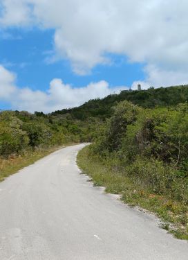 Behind the beach we quickly found a tarmac road with an intriguing hill in front of it and we followed it. We found not cats but goats along the way.
