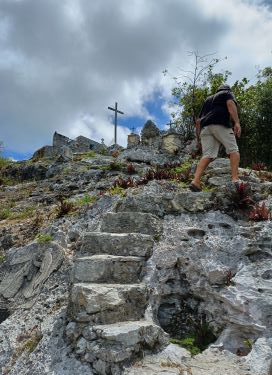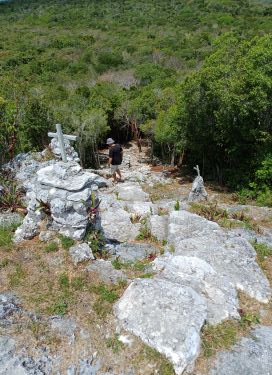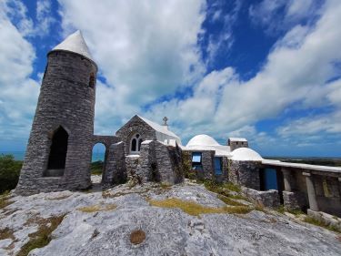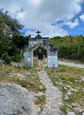 Where the tarmac gave way to a rocky path we found the entrance to one of the most incongruous and unexpected sites we have ever visited. Como Hill is the highest point in the Bahamas at a whopping 63 metres above sea level but it was renamed Mount Alvernia by the Catholic Priest, John Hawes, when he bought the land for $35 and single handedly built the extraordinary hermitage at the top of the hill.