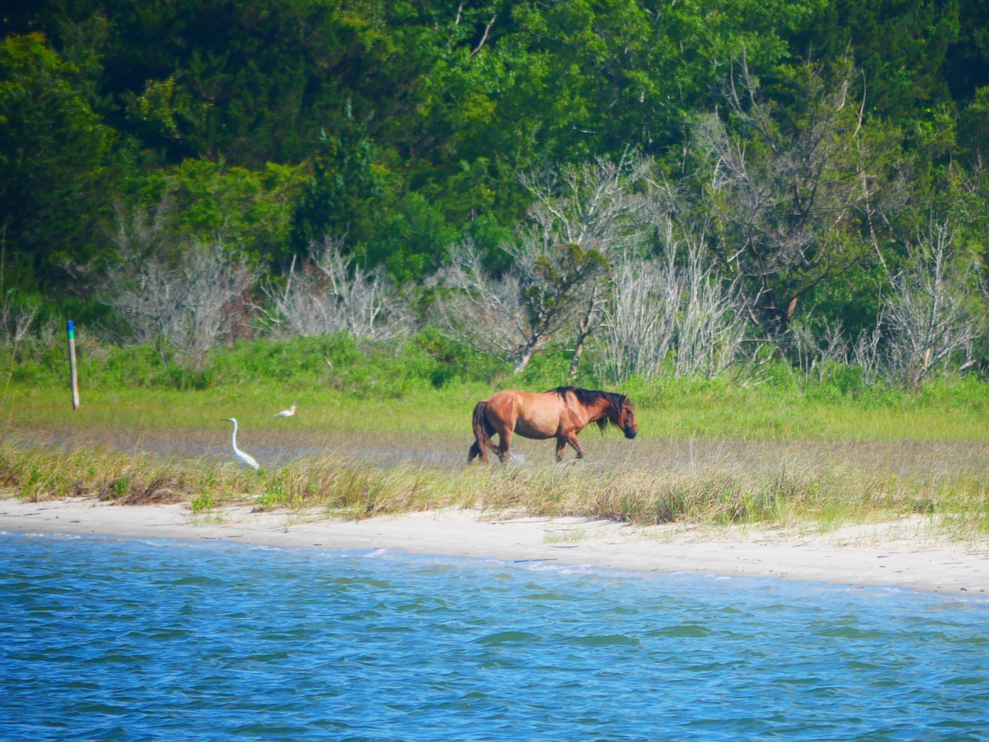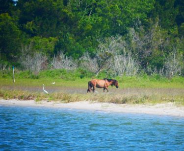 We anchored just outside the channel in Taylor’s Creek, almost close enough to step off the boat onto the beach of the Rachel Carson Reserve, an area of coastal wetlands teeming with wildlife – birds, dolphins and wild horses. On the other side of the creek, however, was the pretty waterside of the town itself with its docks housing some very nice super yachts. That night we could hear live music from one of the restaurants along with the machine gun battle of the popping shrimp beneath us.