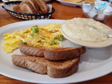 On the day of our intended departure for the Chesapeake Bay we woke to this – thick fog. We learnt the lesson of sailing in fog hard on one of our early passage in Pintail from Dunkerque to Ramsgate and we weren’t going to repeat that around Cape Hatteras so we delayed leaving for a few hours until the fog had lifted. But this gave us time to go to the local diner for our first taste of grits, a sort of savoury porridge made with ground corn. I liked it a lot.