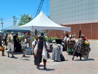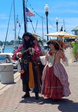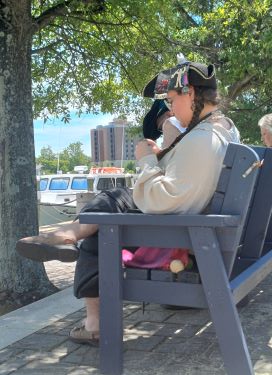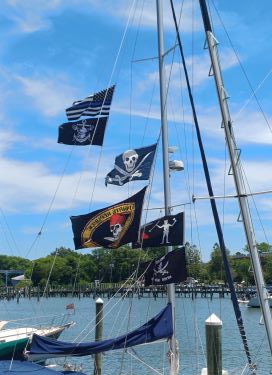 We heard news from neighbours in the anchorage of a pirate festival up the river in Hampton. Blackbeard, the pirate who had terrorised the east coast in the 18th century, was finally been killed off North Carolina in 1718. His head was brought to a spot at the entrance of the Hampton River, now known as Blackbeard’s Point, where it was hung on a pole for years as a warning to others. Too good to miss, we took the dinghy from our anchorage, passed Blackbeard’s Point (head no longer on its pole) and up to modern Hampton to celebrate all things pirate.
