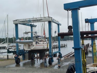 We sailed out of the York River and round into to Piankatank River with a good few days to spare before our scheduled liftout. The anchorage at Fishing Bay was picturesque and quiet and an easy place to hang out. The boatyard let us come on to their pontoons early so we had easier access to land and we collected a load of parcels we’d had delivered. The staff were so friendly we immediately felt at home.