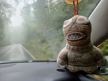 We’ve learnt to roll with the punches of the weather gods but decided against stopping for a hike to a scenic spot which wouldn’t offer much scenery. The drive was certainly atmospheric. We didn’t mind much. We had Miriam Margolyes’ audiobook to entertain us!