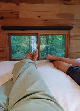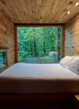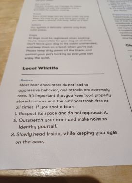 We found our cosy cabin well equipped with survival guides and warnings about the bears that share the woods. We lay watching for any sign of them through the picture windows but saw nothing but squirrels.