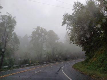 As we climbed higher into the mountains we disappeared into thick cloud. Having paid for our seven day permit, we started out on the Skyline Drive which traverses the ridge but we knew we were not going to see very much. In a brief gap in the cloud we managed just a glimpse of what we were missing.