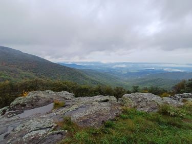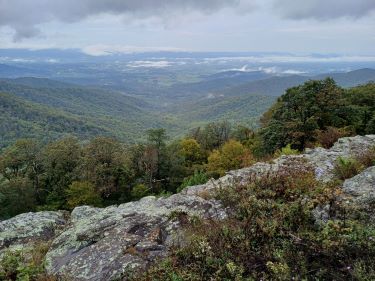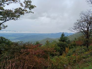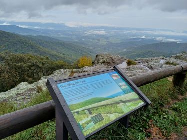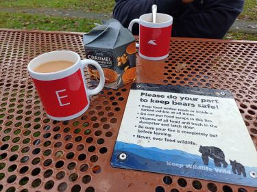 The weather was dry enough to stop for a cup of tea. We were careful to guard our caramel waffles from any lurking bears and although the hiking trail looked tempting we had decided to make an early exit from the Skyline Drive to head into the valley and out of the cloud instead.